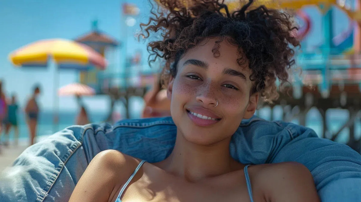 Stylish woman in indigo baggy jeans, Santa Monica Pier backdrop, sunlit diverse features. Spring season.